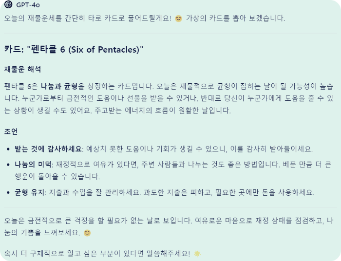 챗GPT를 통해 오늘의 운세, 금전운, 연애운 등 다양한 운세를 확인할 수 있습니다.
